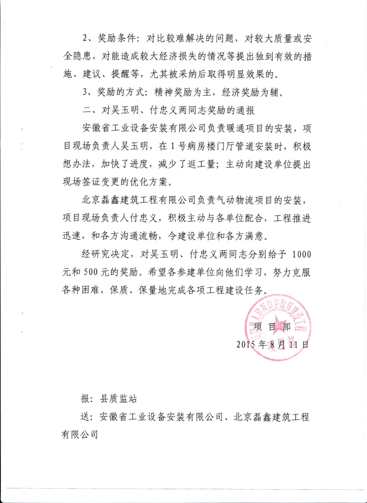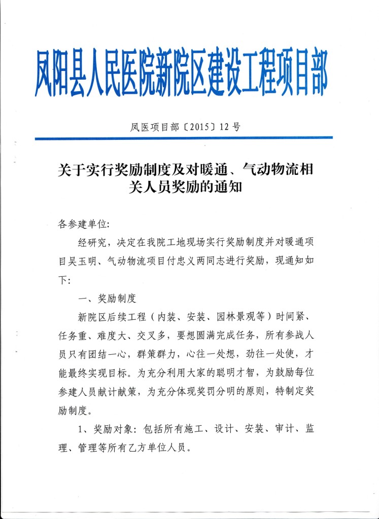 8月11日,鳳陽縣人民醫(yī)院新院區(qū)建設(shè)工程項(xiàng)目部發(fā)來賀文,就公司第九分公司承攬的鳳陽縣人民醫(yī)院新院區(qū)暖通項(xiàng)目安裝工程表示肯定,并對該項(xiàng)目的現(xiàn)場負(fù)責(zé)人吳玉明同志給予表彰和獎勵通報。