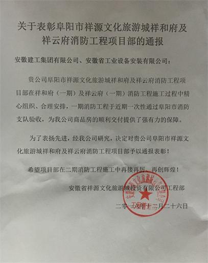 第四分公司阜陽市祥源文化旅游城消防工程項目部受到業(yè)主單位通報表彰
