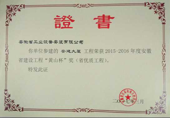 日前,2015-2016年度安徽省建設(shè)工程“黃山杯”(省優(yōu)質(zhì)工程)獲獎(jiǎng)工程項(xiàng)目名單公布,公司參建的“安建大廈”通過(guò)形式審查、現(xiàn)場(chǎng)復(fù)查、評(píng)審委員會(huì)評(píng)審等程序,同獲該項(xiàng)殊榮。至此,公司榮獲“黃山杯”達(dá)11尊。同時(shí)“濱湖中心1-3#樓空調(diào)系統(tǒng)工程 ”還榮獲2017年度中國(guó)安裝工程優(yōu)質(zhì)獎(jiǎng)(中國(guó)安裝之星)。