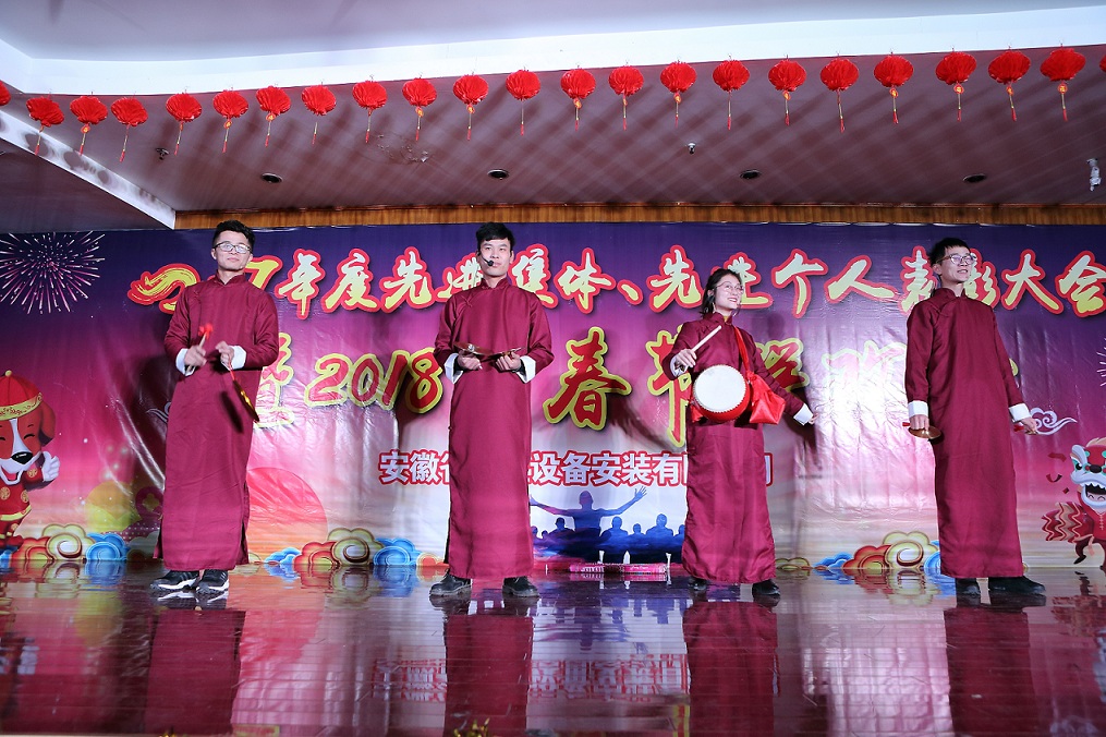 整場(chǎng)聯(lián)歡會(huì)由音歌快板、情景劇、小品、詩(shī)朗誦、舞蹈、才藝表演、女聲獨(dú)唱等12個(gè)節(jié)目組成,均為職工自編自導(dǎo)自演。伴隨著悅耳動(dòng)聽的音歌快板表演《企業(yè)興旺我自豪》,聯(lián)歡會(huì)正式拉開序幕。情景劇《我驕傲 我是省安人》,反映了安徽安裝人用勤勞和汗水,創(chuàng)造了一個(gè)個(gè)值得驕傲的碩果;詩(shī)朗誦《風(fēng)雨同行 以心筑夢(mèng)》,展現(xiàn)了安徽安裝人不斷開拓新市場(chǎng),實(shí)現(xiàn)新突破的壯麗征程;舞蹈《精忠報(bào)國(guó)》,傳遞了安徽安裝人激昂豪邁,強(qiáng)烈愛國(guó)主義的情懷;情景劇《擼起袖子加油干》,表達(dá)了安徽安裝人不忘初心,團(tuán)結(jié)一致砥礪奮進(jìn)的決心;男生合唱《明天會(huì)更好》,抒發(fā)了全體安徽安裝兒女同心同德,共筑企業(yè)燦爛明天的美好心愿,歡快的音符,優(yōu)美的旋律,振奮的歌詞,贏得了現(xiàn)場(chǎng)觀眾的歡呼喝彩與陣陣掌聲,將現(xiàn)場(chǎng)的氣氛推向高潮。演出過程中還穿插了抽獎(jiǎng)和游戲環(huán)節(jié)。