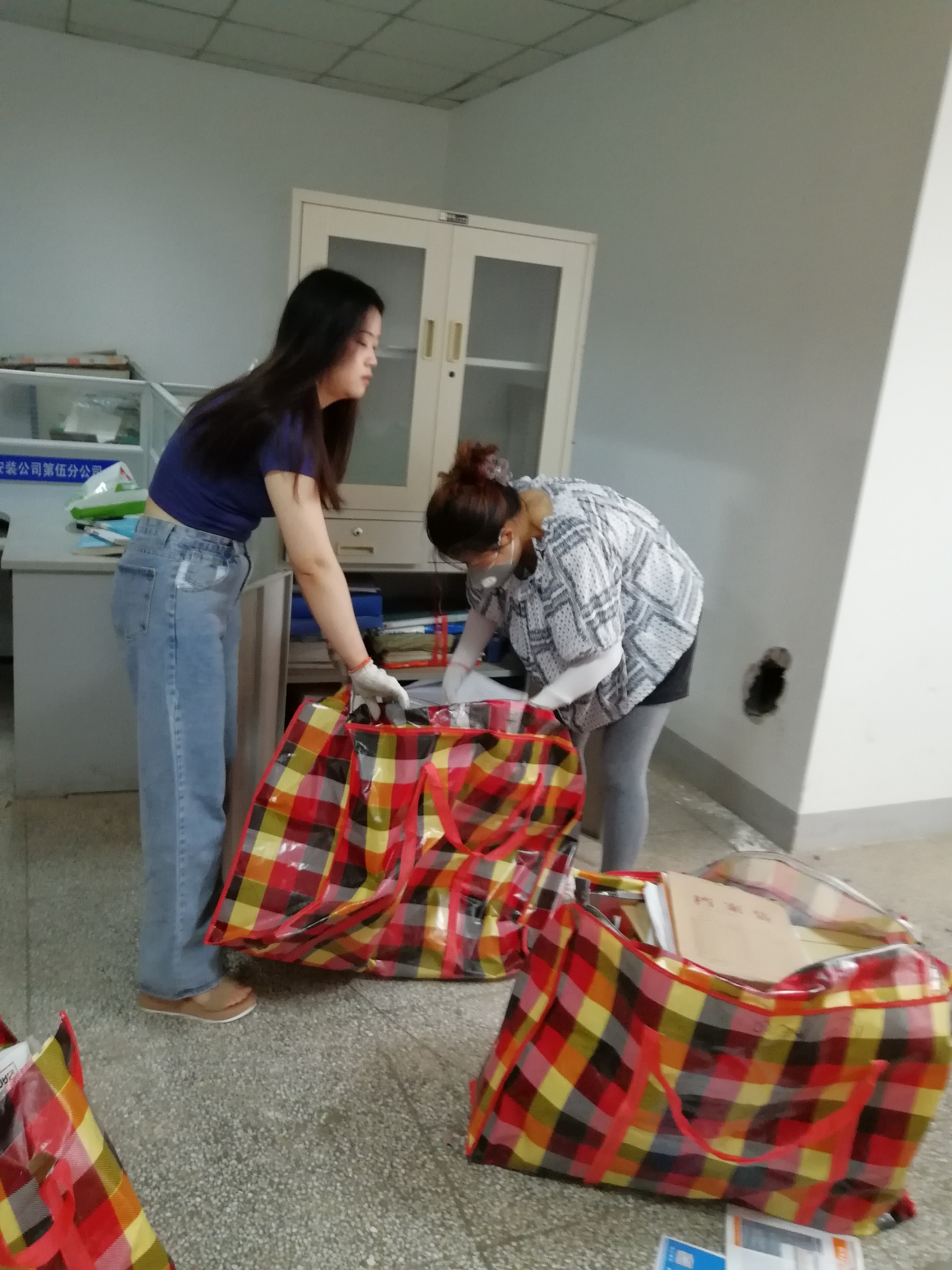 火熱的場面瞬間拉開了,不到10分鐘,大家的衣服都被汗水浸透了。此時室外實時溫度達到38度,但烈日炎炎也抵擋不住他們的干勁。有的負責(zé)將倉庫里疊加很高的設(shè)備、物資卸下,有的負責(zé)將卸落的設(shè)備、物資運至搬運待放點,還有的將待放點設(shè)備、物資搬遷至1樓大倉庫存放。大家一趟接著一趟、一件接著一件、所有人配合默契、分工明確,歷時4個小時,將老干部樓里全部的設(shè)備物資全部轉(zhuǎn)運到大倉庫,圓滿完成此次任務(wù)。