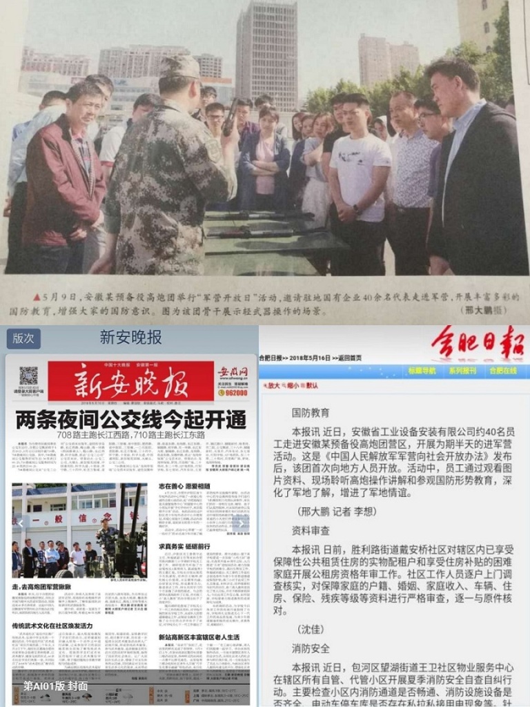 自5月9日安徽安裝公司組織開展赴安徽預備役師高炮團營區開展“走進軍營·感受軍魂”愛國主義教育實踐活動以來,合肥日報、新安晚報、人民陸軍報等多家媒體對此活動進行了報道。