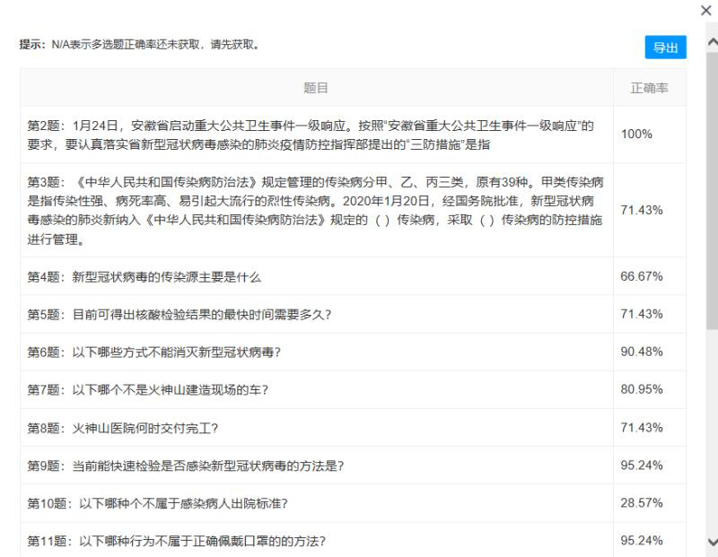 本次疫情防控知識答題通過在分公司微信群發(fā)送答題鏈接開展,內(nèi)容涵蓋新冠肺炎基本知識、疫情防控措施、員工居家防控等多項(xiàng)內(nèi)容,同時(shí)還對上級在疫情期間下發(fā)的各類疫情防控工作指導(dǎo)意見、措施等進(jìn)行了宣貫。此次活動,員工參與率達(dá)到了100%,不僅加強(qiáng)了員工對防疫知識的了解,還提高了預(yù)防疾病自我保護(hù)的意識,防疫知識掌握情況總體較好。通過參與答題,廣大員工進(jìn)一步了解了新冠肺炎的傳播途徑及相關(guān)防護(hù)措施,表示要努力做到認(rèn)真理性對待疫情,保持良好個(gè)人生活習(xí)慣和公共衛(wèi)生習(xí)慣,遵守疫情防控工作要求,胸懷全局、統(tǒng)一思想,堅(jiān)決打贏疫情防控阻擊戰(zhàn)。