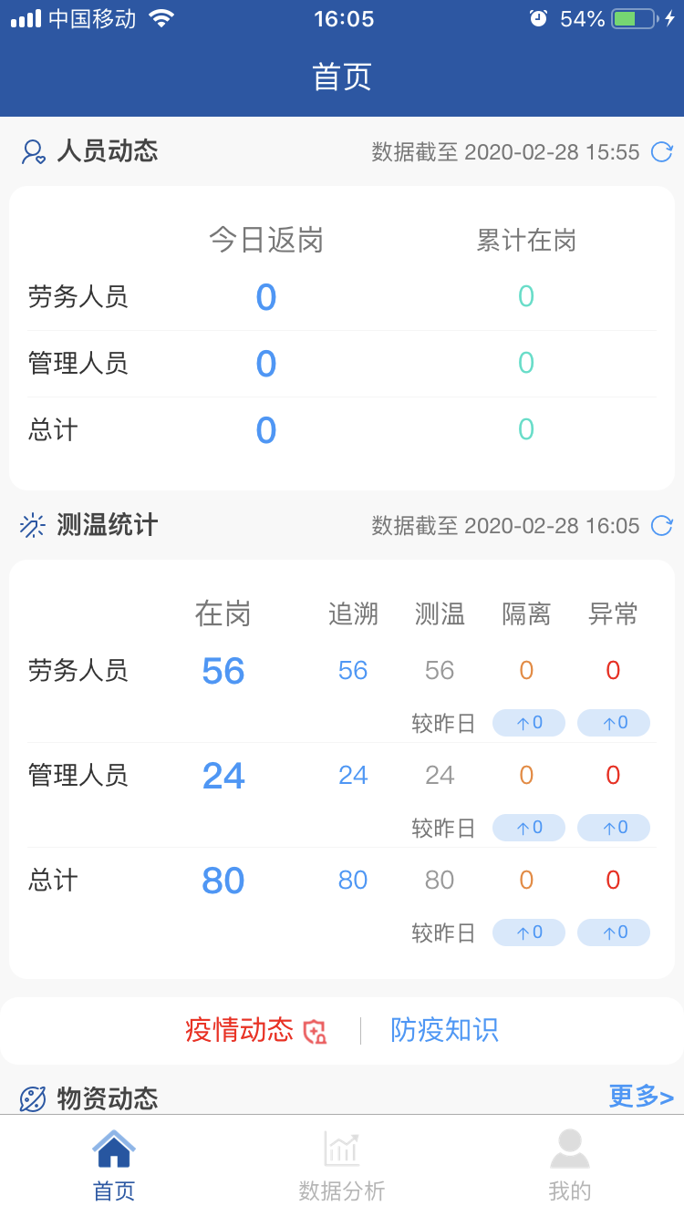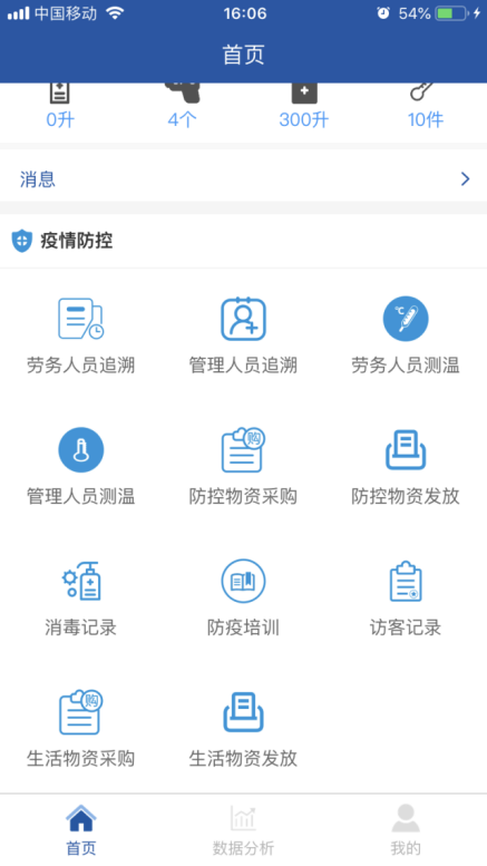項目全面推行“返崗復工疫情防控系統(tǒng)”APP。主頁面包括勞務人員追溯、勞務人員測溫、防控物資采購、消毒記錄、疫情培訓等11個專題版面,通過這些功能可線上及時填報人員返崗日期、體溫、癥狀及是否為留守人員等詳細信息,還有項目部的疫情物資采購情況、環(huán)境衛(wèi)生的消殺情況等相關信息,使上線人員時時了解疫情防控動態(tài),充分借助信息技術手段,全力打贏疫情防控“戰(zhàn)役”。 借助這一平臺確保項目部實時、準確、有效地掌握現(xiàn)場人員的健康情況,助力疫情防控工作。