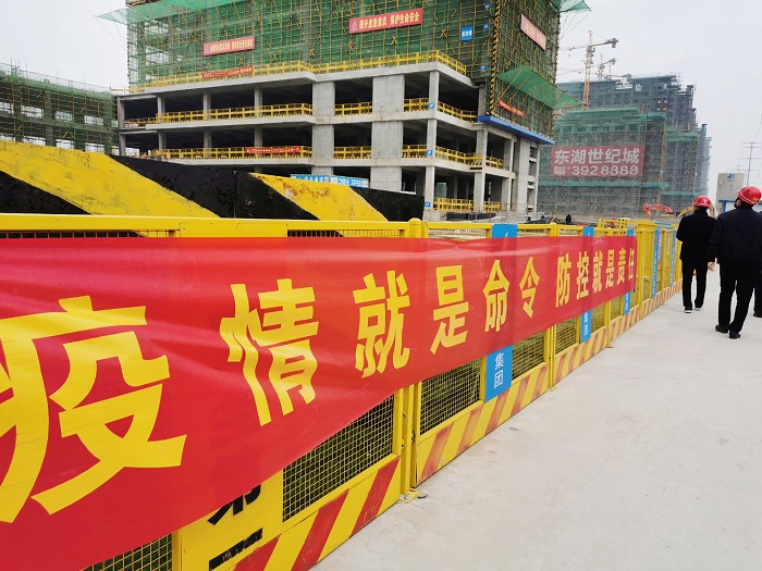 戴口罩、測體溫、問信息,這是走進每個項目的標配動作。進入施工區(qū),戴著口罩的企業(yè)員工、醒目的宣傳防疫標語、專用的口罩回收桶、集中居住管理的員工宿舍……時時刻刻提醒著你:這個非常時節(jié),疫情防控絲毫不能懈怠。