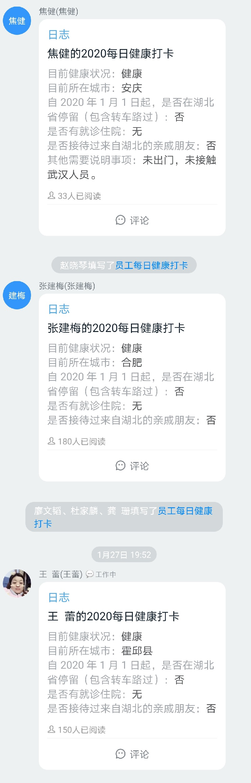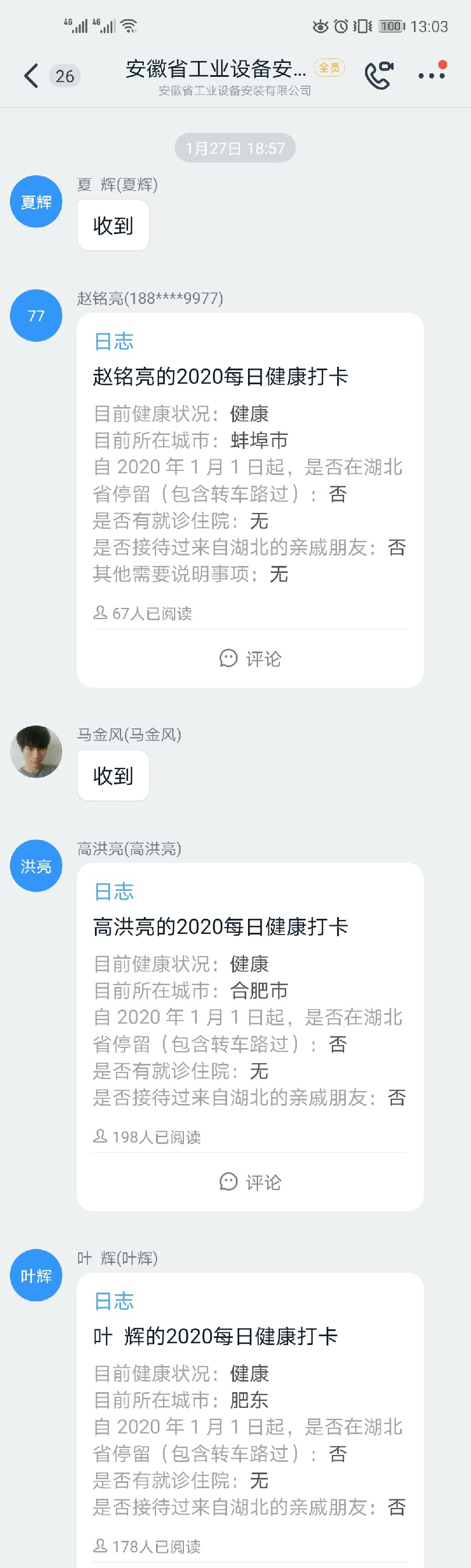 1月27日(大年初三),公司下發(fā)《安徽安裝公司關(guān)于做好新型冠狀病毒肺炎疫情工作的防控措施》,全體員工每日在釘釘日志專項(xiàng)報告當(dāng)日去向及身體狀況,各分公司、各部門認(rèn)真做好登記,確保信息及時準(zhǔn)確,時刻密切關(guān)注員工的身體健康狀況。