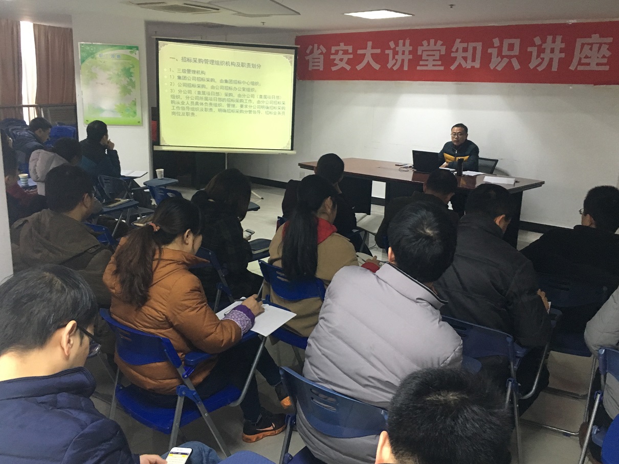 12月7日上午“省安大講堂”—招標業務培訓在職工之家開課。本次培訓由招標辦副經理李文山授課,公司機關、分公司、項目部相關人員共30余人參加。