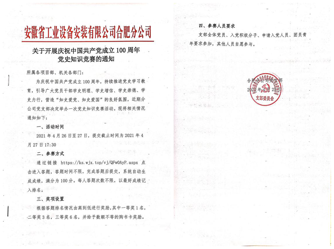為慶祝中國共產(chǎn)黨成立100周年,持續(xù)推進(jìn)黨史學(xué)習(xí)教育,引導(dǎo)分公司黨員干部學(xué)史明理、學(xué)史增信、學(xué)史崇德、學(xué)史力行,營造“知史愛黨、知史愛國”的良好氛圍,4月26日-27日,合肥分公司黨支部組織開展了黨史學(xué)習(xí)教育知識競賽活動。