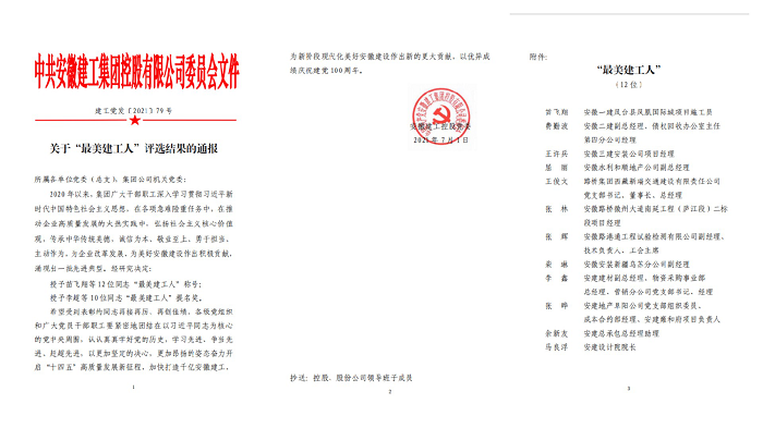 7月1日至7月2日,安徽建工集團控股有限公司二屆一次職工代表大會暨“七一”表彰會在合肥召開。會上表彰了12名“最美建工人”榮譽稱號獲得者,安徽安裝公司柴琳獲此殊榮。