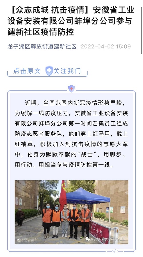 活動(dòng)前,分公司黨支部主動(dòng)對(duì)接建新社區(qū),該社區(qū)為蚌埠市優(yōu)秀社區(qū),位處老城區(qū),管轄范圍較廣、人員出入繁雜,了解情況后,支部及時(shí)在分公司QQ工作群發(fā)出疫情志愿者活動(dòng)倡議,分公司班子成員帶頭報(bào)名,廣大員工積極響應(yīng),短短兩天收到20余人報(bào)名申請(qǐng),并組建了志愿者服務(wù)隊(duì)。