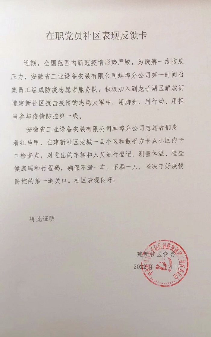 通過(guò)本次活動(dòng),志愿者們用實(shí)際行動(dòng)踐行了初心和使命,展現(xiàn)了安徽安裝志愿者飽滿的精神風(fēng)貌。建新社區(qū)黨委表達(dá)了對(duì)于安徽安裝公司的真誠(chéng)感謝,期間社區(qū)及時(shí)通過(guò)微信公眾號(hào)對(duì)安徽安裝積極擔(dān)當(dāng)社會(huì)責(zé)任予以報(bào)道,有效擴(kuò)大了企業(yè)影響力,樹(shù)立了良好企業(yè)形象。