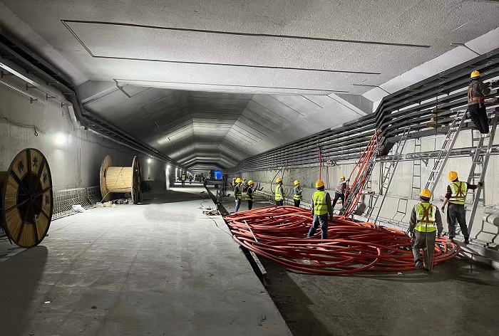 目前,項目下穿隧道東、西側1#2#配電房一次性送電成功,能夠提供隧道現場施工用電,東側雨水泵房和中間廢水泵房已完成施工任務,隧道里的橋架安裝、電纜敷設、消防水管安裝、照明燈具安裝及各附屬設施安裝建設也正在加速進行當中。