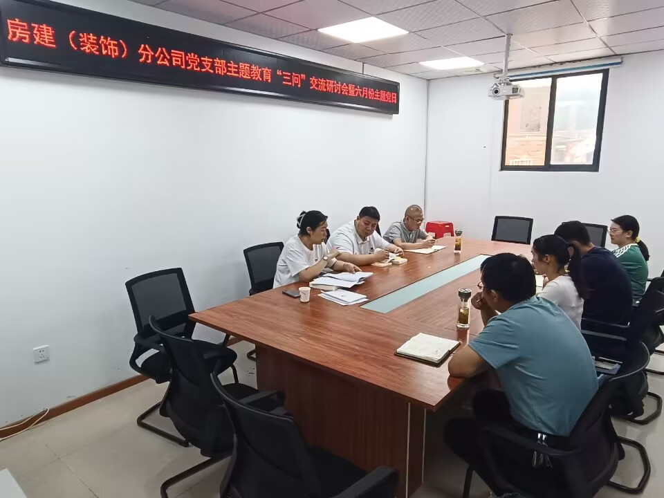 為深入學(xué)習(xí)貫徹習(xí)近平新時(shí)代中國(guó)特色社會(huì)主義思想主題教育,抓實(shí)支部理論學(xué)習(xí),努力在以學(xué)鑄魂、以學(xué)增智、以學(xué)正風(fēng)、以學(xué)促干方面取得實(shí)效。6月16日下午,房建(裝飾)分公司黨支部在會(huì)議室組織召開主題教育“三問”交流研討會(huì)暨六月份主題黨日活動(dòng)。會(huì)議由支部書記程茂麗主持,支部全體黨員參加。