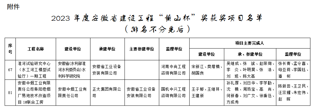 7月25日,安徽省住房和城鄉建設廳 、安徽省交通運輸廳、安徽省水利廳聯合發布《關于公布2023年度安徽省建設工程“黃山杯”獎獲獎項目名單的通知》,由建工安裝集團蚌埠分公司承建的“淮河試驗研究中心(水工河工模型試驗廳)一期工程”和參建的“安徽中煙工業有限責任公司阜陽卷煙廠易地技術改造項目1#聯合工房”等2個項目均獲2023年度安徽省建筑行業建設工程質量最高榮譽獎“黃山杯”。其中“淮河試驗研究中心(水工河工模型試驗廳)一期工程”是建工安裝公司首次作為承建單位獲此殊榮;“安徽中煙工業有限責任公司阜陽卷煙廠易地技術改造項目1#聯合工房”項目同時正在申報國家級安裝行業最高獎項中國安裝工程優質獎(安裝之星),5月份預檢已通過,等待9月復檢。兩個項目作為承建和參建單位一舉捧得2樽“黃山杯”,也是蚌埠分公司歷史首次,同時也是蚌埠分公司近年來捧得的第5、第6樽“黃山杯”獎項。