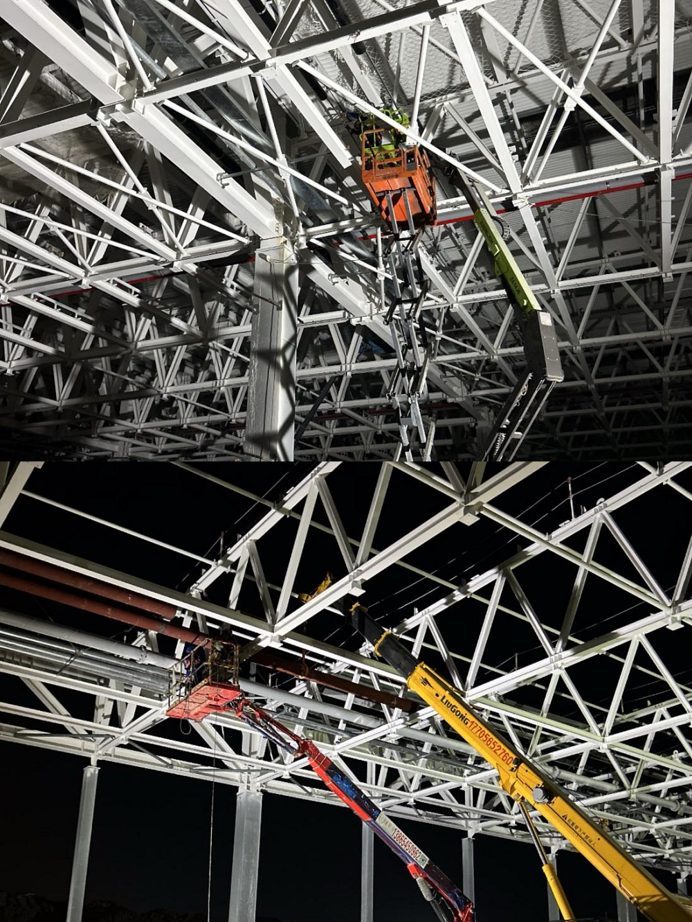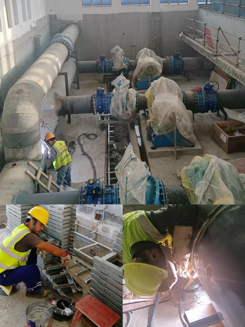 圖為合肥七水廠三期電安裝項(xiàng)目電纜溝支架刷漆、碳濾池管廊水沖管焊接