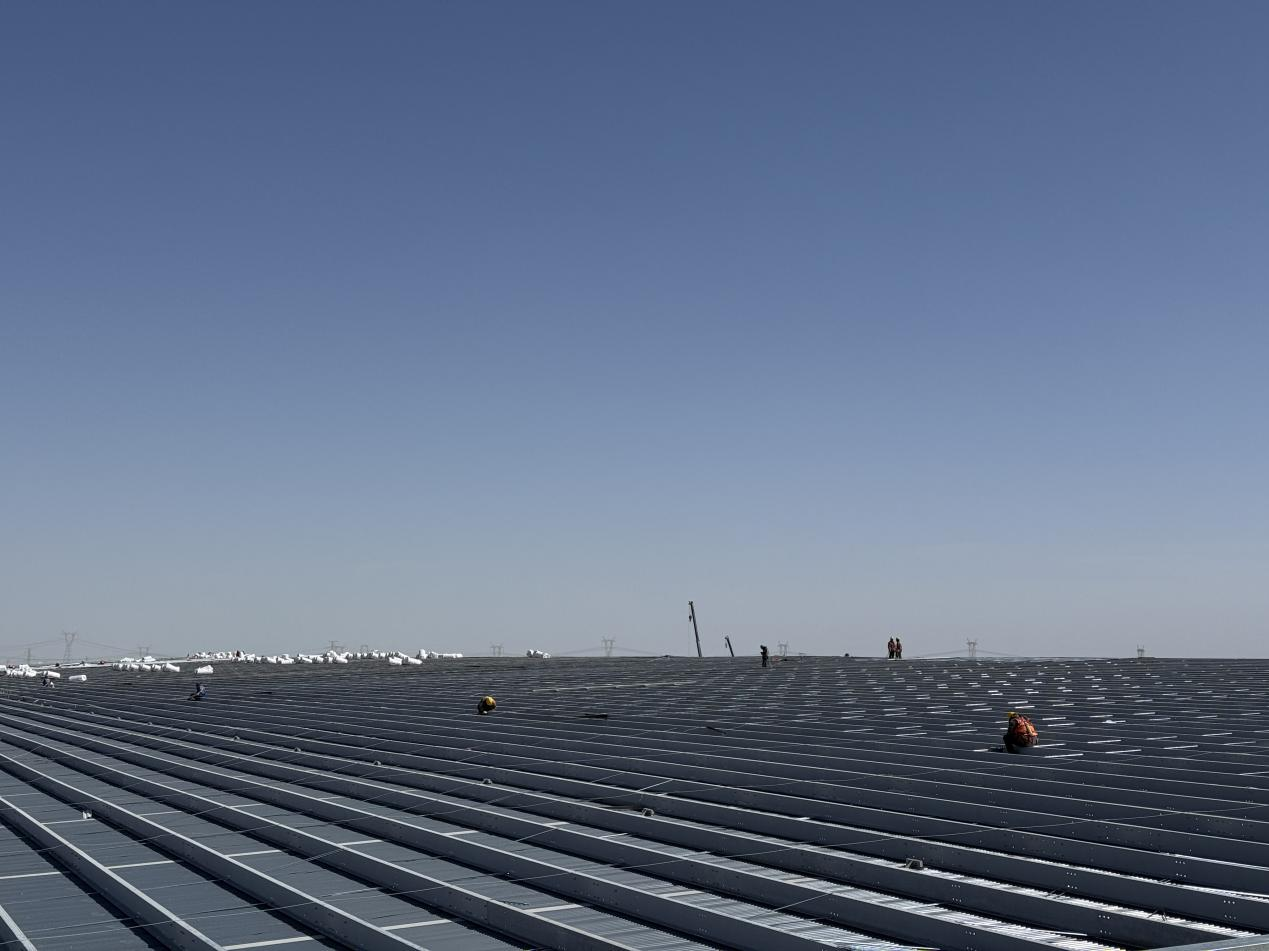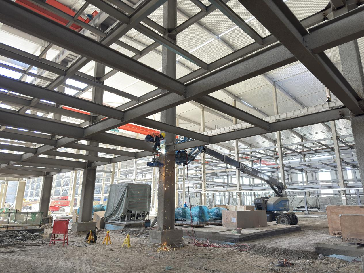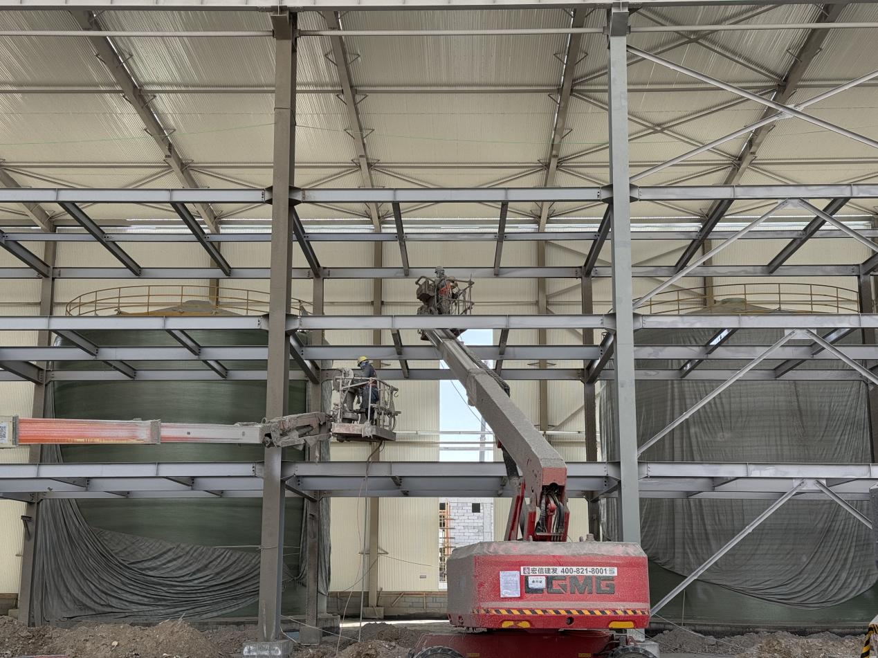 項(xiàng)目地處高海拔鹽湖區(qū),缺氧且淡水匱乏,施工環(huán)境惡劣,資源保障困難。面對不利因素,項(xiàng)目團(tuán)隊(duì)迎難而上,積極尋找解決方案,為項(xiàng)目順利推進(jìn)筑牢基礎(chǔ)。截至目前,項(xiàng)目已取得顯著階段性成果,廠房主鋼構(gòu)全部完成,管廊鋼結(jié)構(gòu)完成約95%,防火涂料完成80%,屋面及墻面圍護(hù)結(jié)構(gòu)完成約50%,配電房裝飾裝修工作有序進(jìn)行,各項(xiàng)任務(wù)按計劃穩(wěn)步推進(jìn)。